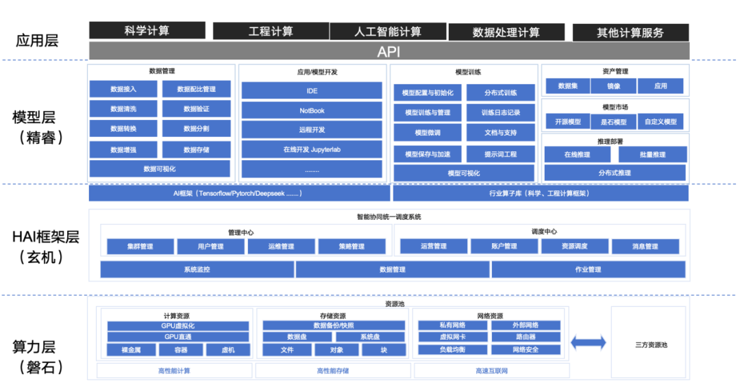 在创立早期,是石就构建了包括超算和智算在内的底层算力,并向上搭建算力调度平台、Infra优化框架以及应用服务在内的全栈能力。目前已构建起HAI统一计算平台。