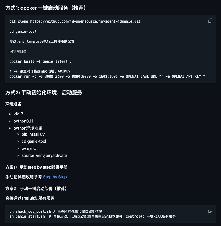 它有两种方式可以快速开始:一种是docker一键启动服务;另一种是手动初始化环境,启动服务。