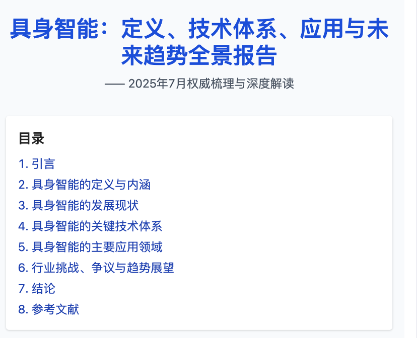 最后生成的可视化报告也挺全面,囊括具身智能的定义、理论基础、发展现状、关键技术体系、主要应用领域以及行业挑战与未来趋势。