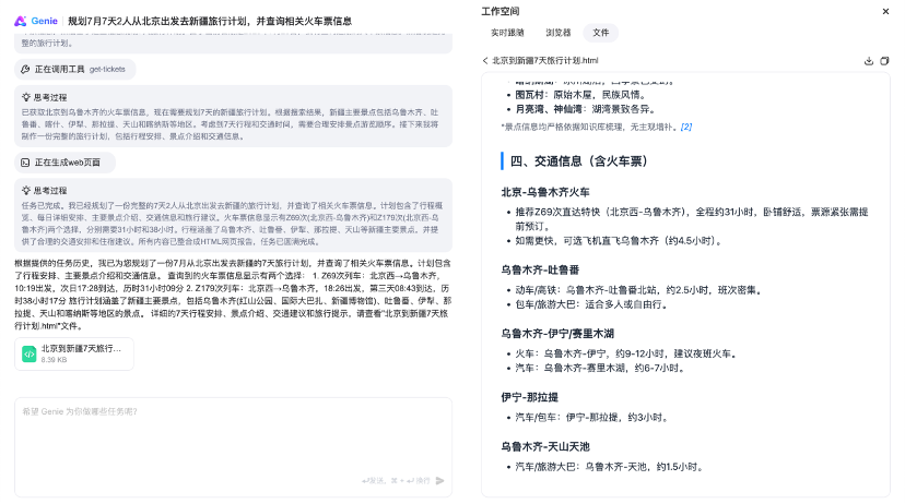 比如添加一个12306工具之后,规划7月7天2人从北京出发去新疆的旅行计划,并查询相关火车票信息。它就开始规划、调用工具查询,最终输出报告。