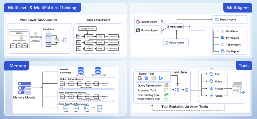 智能体主要包括SearchAgent、ReportAgent、CodeAgent等,工具包含多种文档处理工具、不同报告生成工具如html、ppt、markdown、表格生成工具,支持多种样式输出。