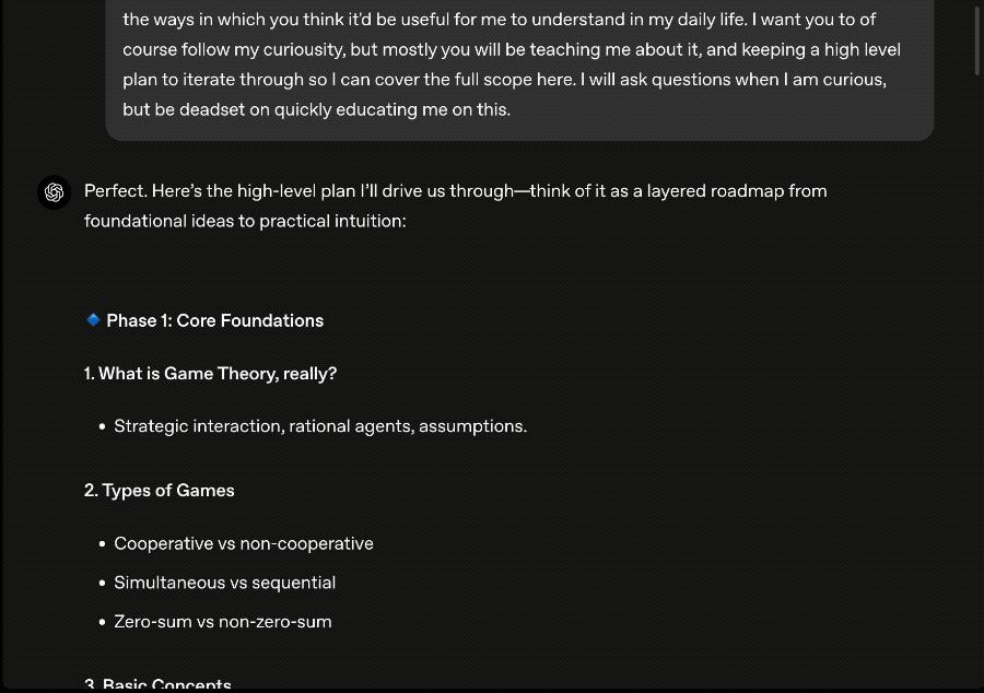 在演示中,当学生想学习”博弈论”时,学习模式首先制定了一个从核心基础到实际应用的多阶段学习路线图。