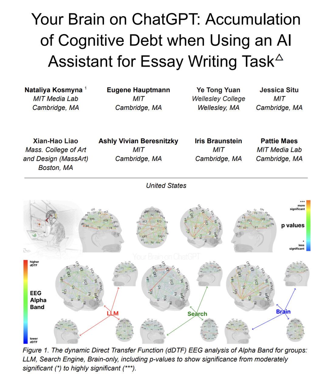 比如此前MIT一项研究发现,与使用谷歌搜索或完全不使用ChatGPT的人相比, 使用ChatGPT写作文的人在写作过程中的大脑活动较低。