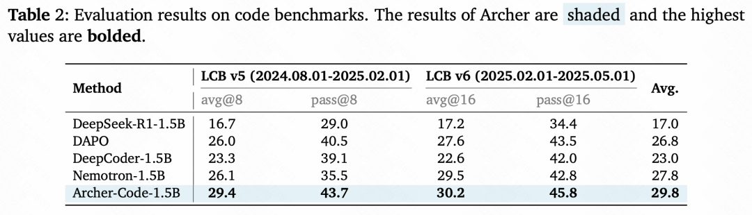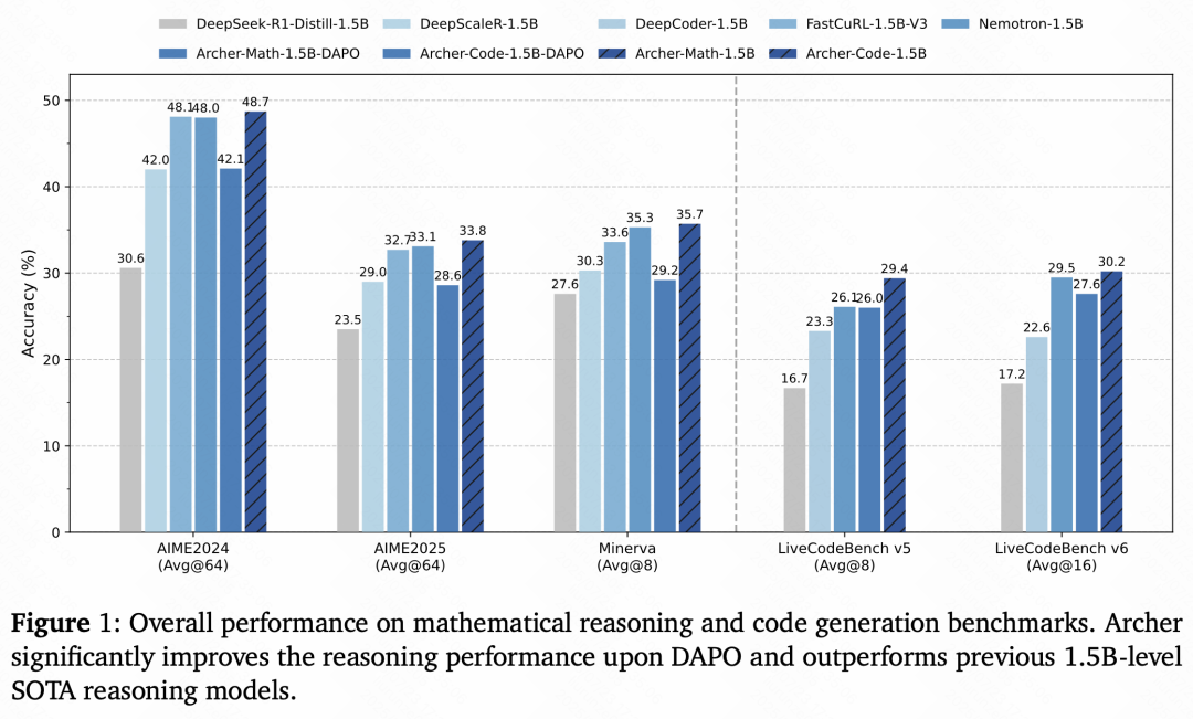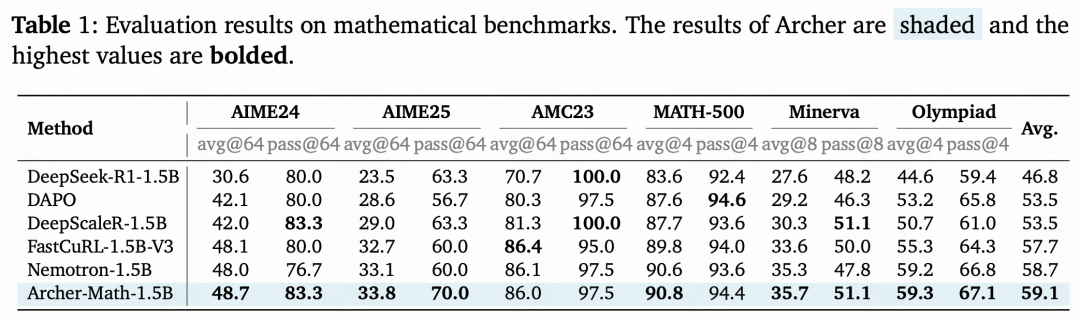 在多个挑战性的数学、代码评测基准上,该团队提出的Archer方法都展现出了强大的实力。