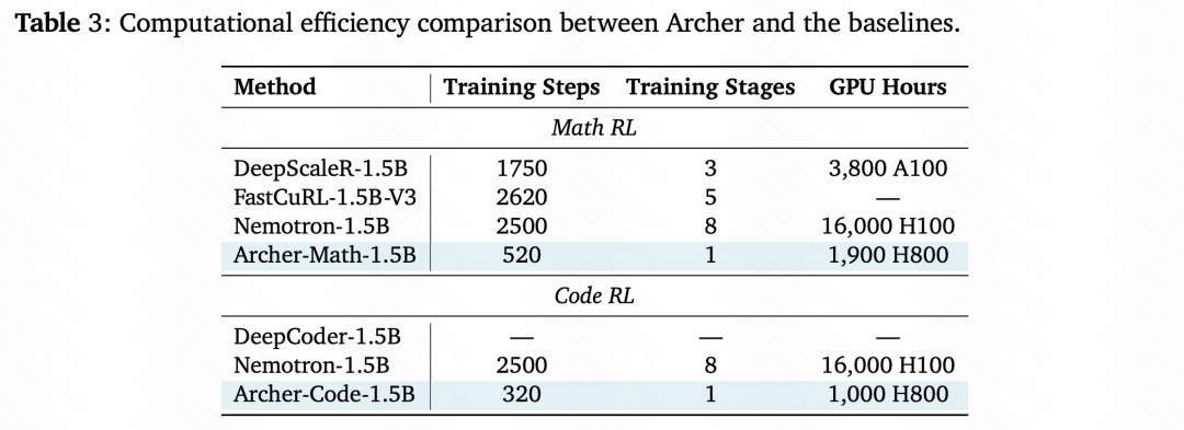 效率方面,Archer只用单阶段训练、1900 H800 GPU小时(对比Nemotron的16000 H100小时),就实现了这些提升。