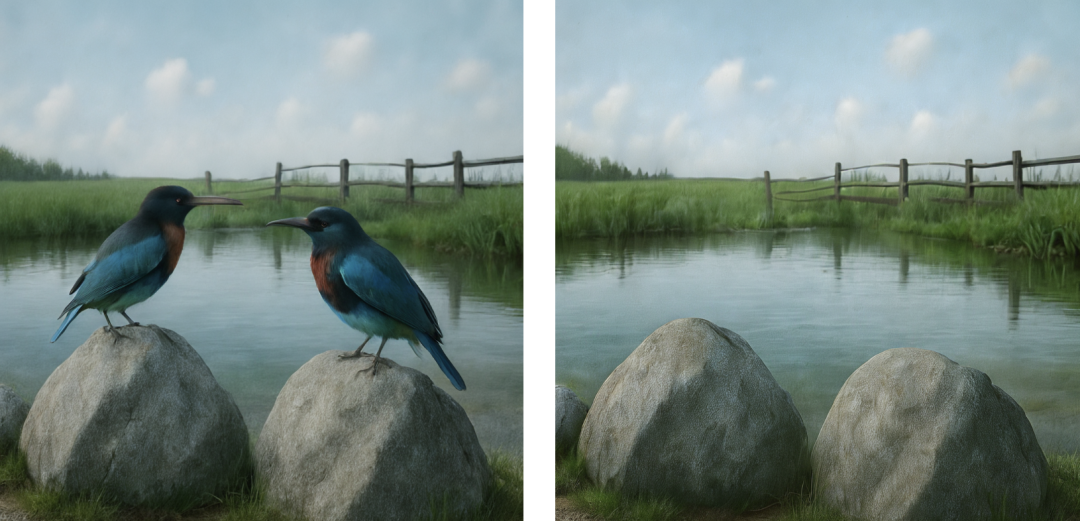 例如,当指令要求“Remove the birds from the image.(将图中的鸟移除)”时,即便鸟横跨草甸、湖面、石头等多个区域,Skywork UniPic仍能精准移除。对于湖面被遮挡的倒影,模型也能依据场景的光影逻辑与物体关联性,进行自然且连贯的补全,最终呈现出毫无编辑痕迹的画面效果。