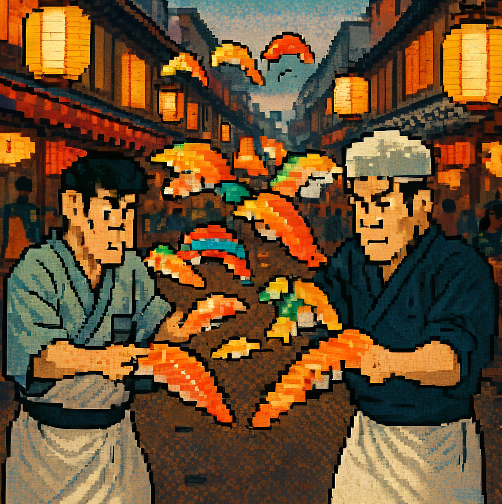 提示词:两位寿司师傅在江户时代熙攘的街市投掷彩虹寿司。他们头顶的纸灯笼明灭闪烁。整个场景呈现出像素化的复古游戏画风。