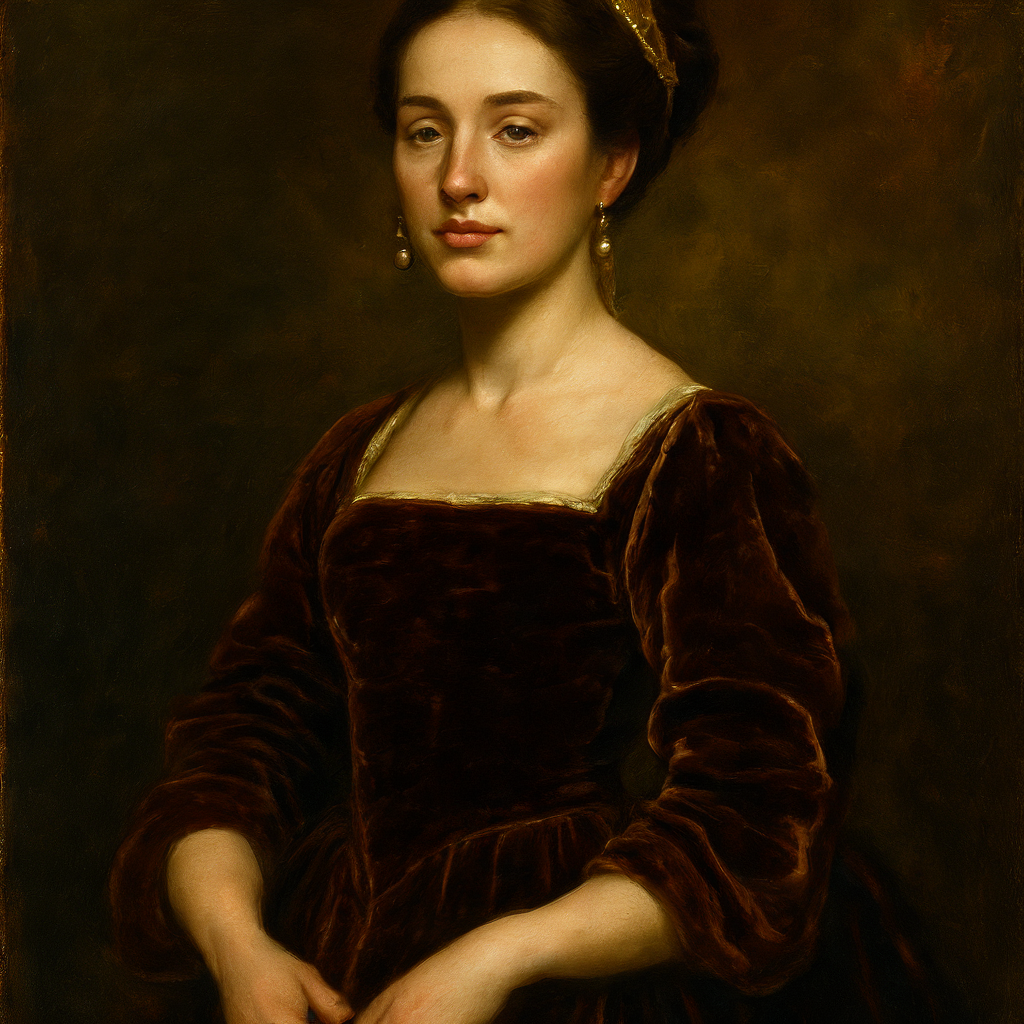 一幅身着丝绒长裙的贵妇人油画