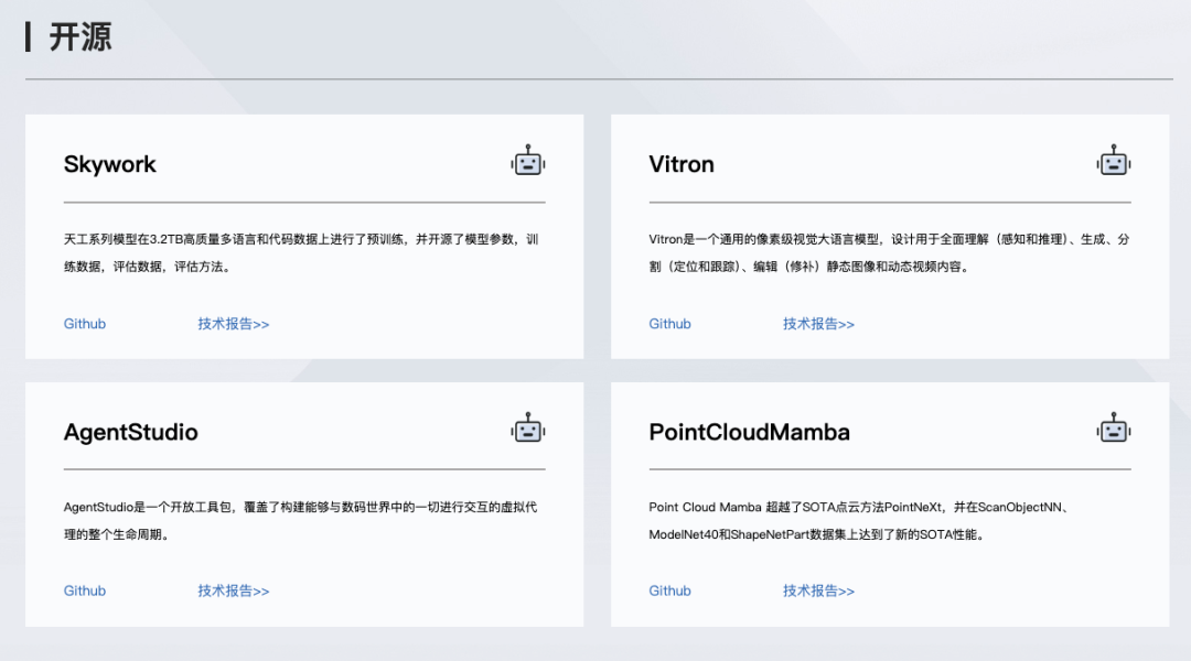 从2024年开始,又陆续开源数字智能体全流程研发工具包AgentStudio、“天工大模型3.0”4000亿参数MoE超级模型、2千亿稀疏大模型Skywork-MoE、Skywork-o1-Open等模型。