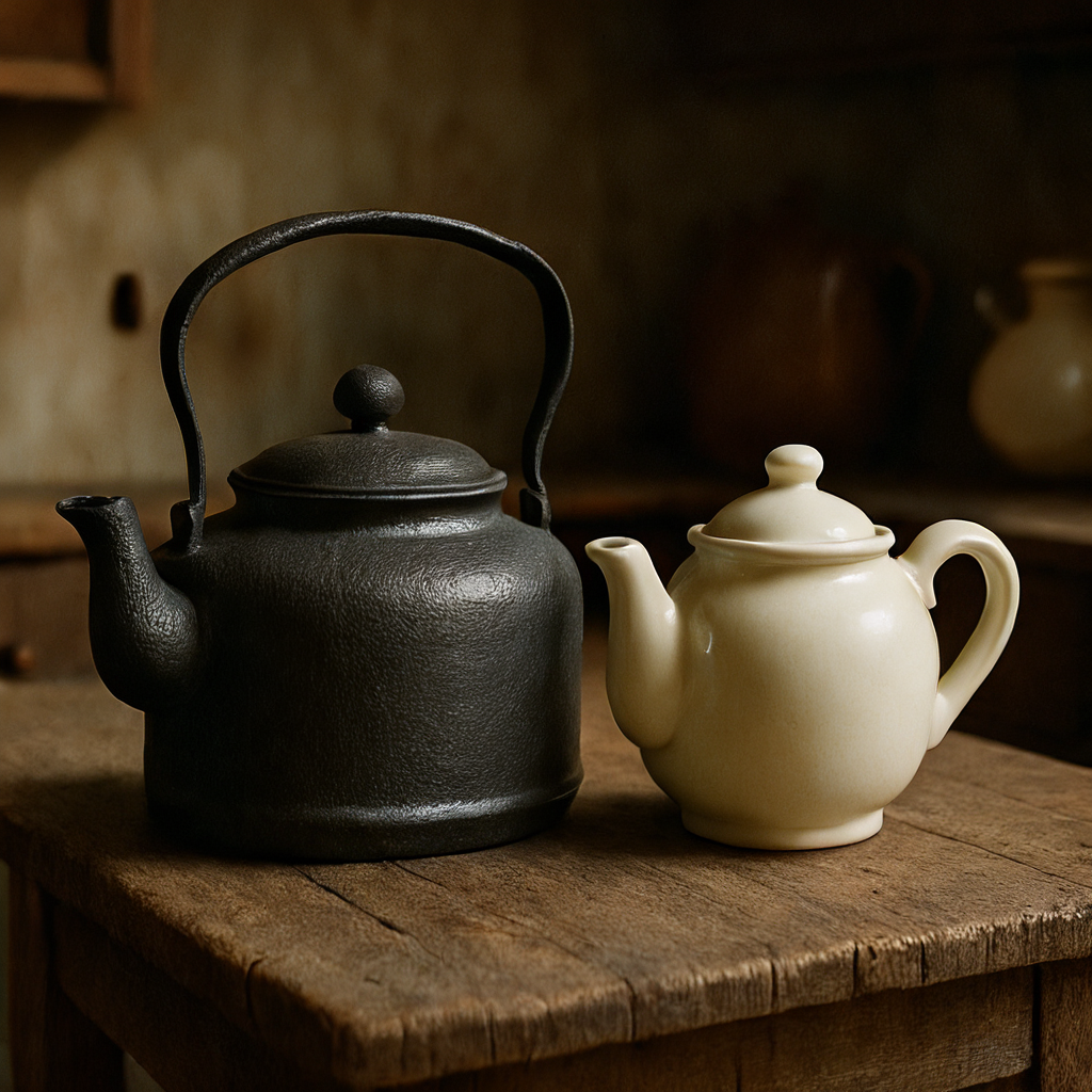 △文生图prompt:一幅老式厨房场景,铸铁水壶与陶瓷茶壶置于粗削木桌上。