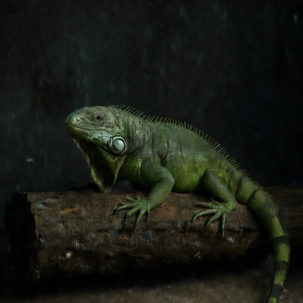 △文生图prompt:一只纹理鲜明的绿色鬣蜥静卧在饱经风霜的树干上,倚靠着一堵幽暗墙壁。