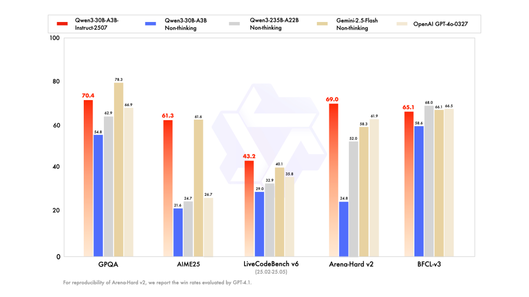 相较前代的非思考模型Qwen3-30B-A3B Non-Thinking,这次“小更新”使模型的通用能力方面得到了关键提升。