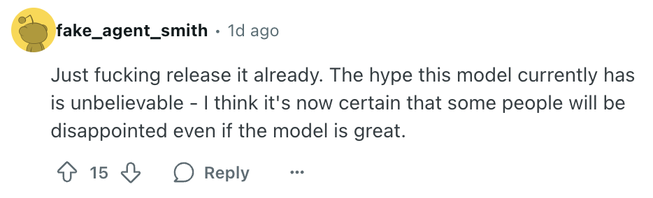 社区里也弥漫着相似的观点,毕竟已经被奥特曼溜了太多次,再不发布,网友们都累了……