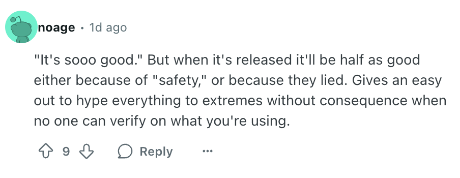 也有人表示这可能是因为模型发布后,出于安全考量会ban一部分能力,所以让大家感觉这是炒作出来的幻象。