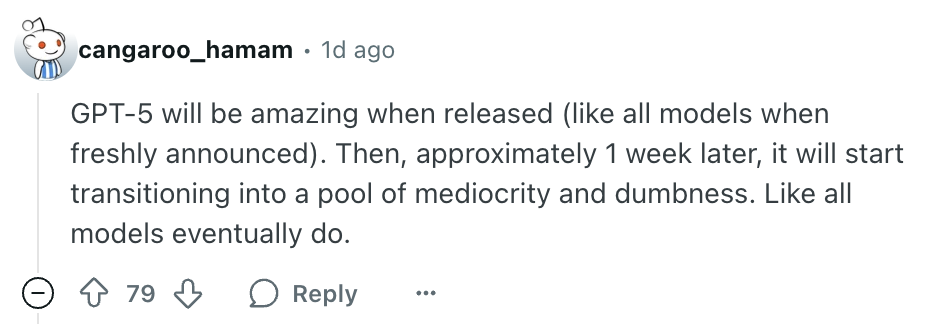 有人就说,那又如何?GPT-5可能在刚刚发布时表现很好,1周过去它就会开始变笨,像此前所有模型一样。