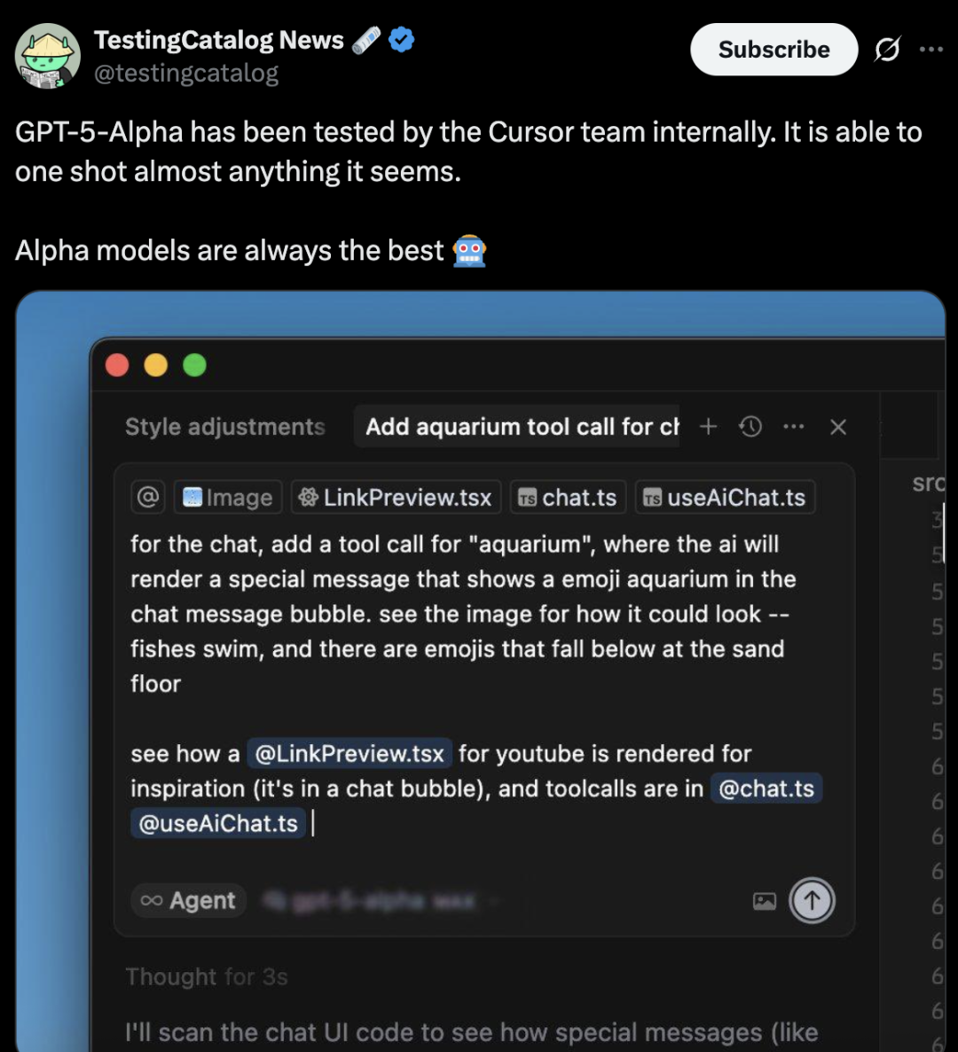 同时也有人发现,cursor团队正在内部测试GPT-5 Alpha版本(图中被模糊掉的部分原来标了GPT-5-Alpha)。