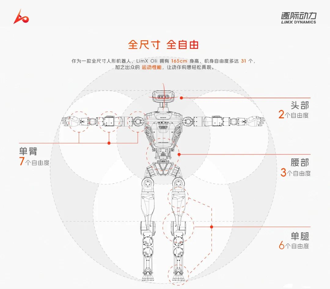 165cm身高背后,LimX Oli机身(不含末端执行器)还拥有31个主动自由度,涵盖头部、躯干、手臂、腿部等关键部位: