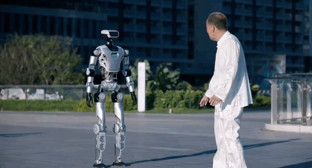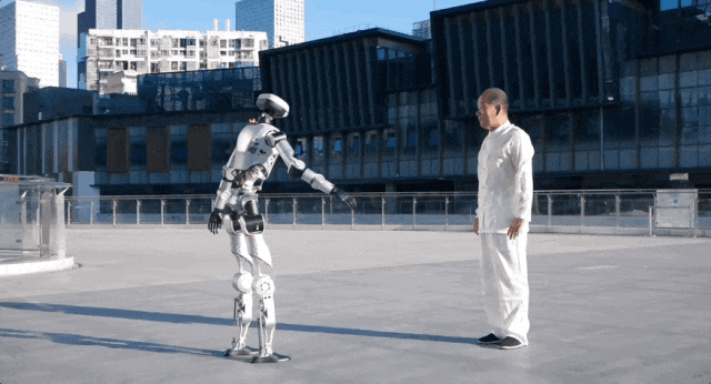 来看LimX Oli早起和老大爷们打太极·拳的画面,对比对比二人的身型和招式: