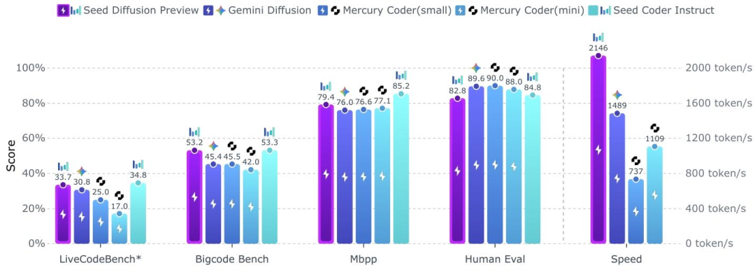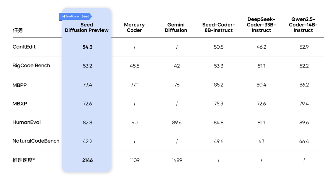 最高可达每秒2146个token,同时保持了代码生成质量的竞争力,性能与优秀模型相当,尤其是在代码编辑任务中优势更明显。
