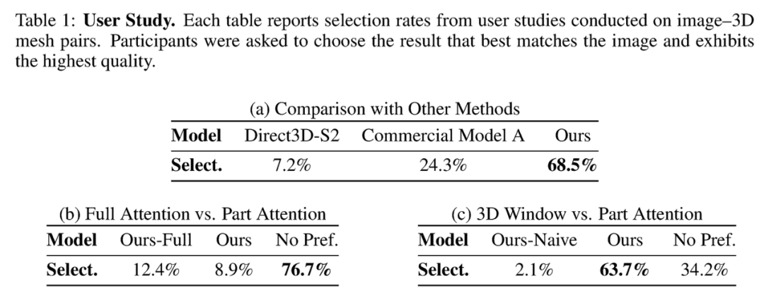 与其他方法的对比实验和user study表明,Ultra3D在生成质量上远超了之前的SoTA方法,能生产具有高精度细节的高分辨mesh。attention的ablation实验也表明part attention是更加适用与3D生成的local attention机制。
