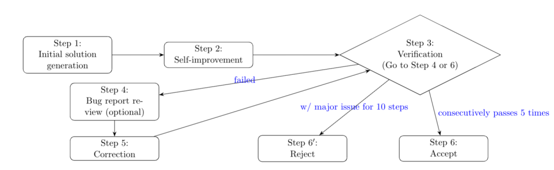 当发现问题后,验证器随即会输出一份错误报告,为模型改进解决方案提供有用信息,在步骤4中对验证器的误判进行改正,然后模型根据报告尝试改进答案。