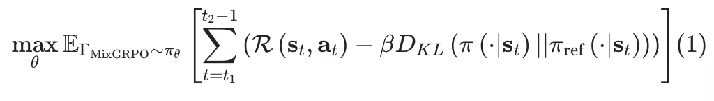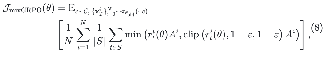 MDP中的其他设置保持不变。MixGRPO不仅降低了计算开销,同时也减轻了优化难度。接下来,研究团队推导MixGRPO的具体采样形式和优化目标。