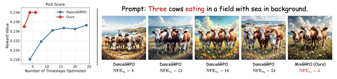 此外,MixGRPO解耦了去噪阶段的优化与奖励计算,使得后者能够通过高阶求解器实现加速。