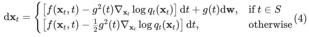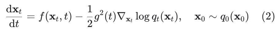 根据Fokker-Planck方程(risken1996fokker),song2020score证明了式(2)具有以下等价的概率流SDE,该SDE在每个时间点