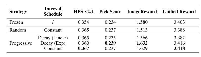 研究团队发现,即使滑动窗口保持不动(Frozen),仅优化较早的时间步,MixGRPO依然能够取得良好效果,尤其是在ImageReward和UnifiedReward指标上表现突出。