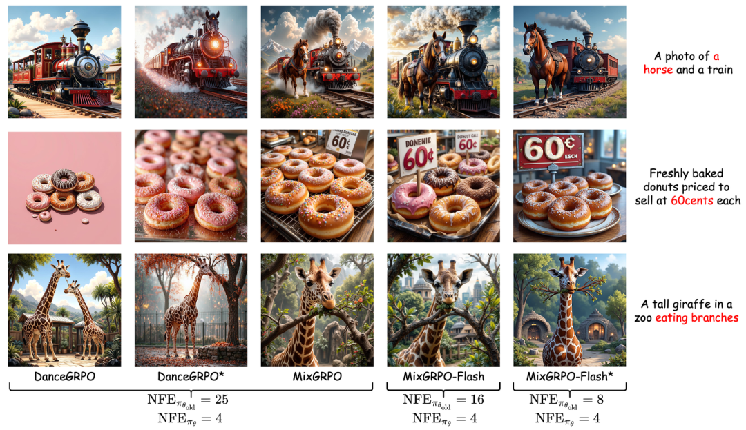基于MixGRPO,研究人员提出了一个更快的变体MixGRPO-Flash,在保持相近性能的同时进一步提升了训练效率。