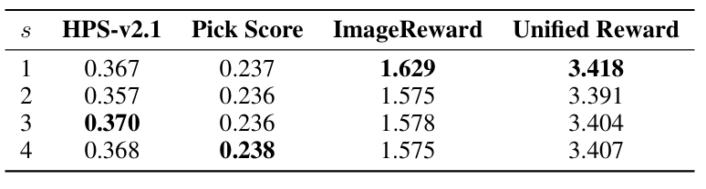 研究团队使用四个奖励模型作为训练中的奖励指导及性能评估指标,分别是HPS-v2.1、Pick Score、ImageReward和Unified Reward。
