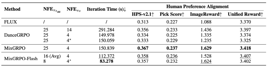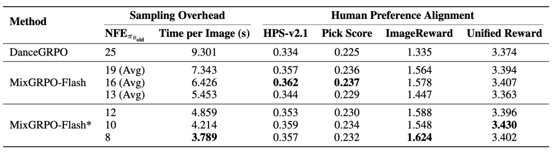 可以观察到,在相同开销下,MixGRPO的表现优于DanceGRPO;同时MixGRPO-Flash通过加速采样