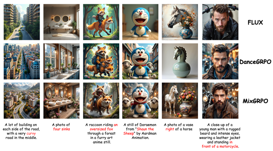 研究团队选取了多个场景提示语,对FLUX.1 Dev、官方配置的DanceGRPO以及MixGRPO的生成结果进行了可视化展示,见图3。