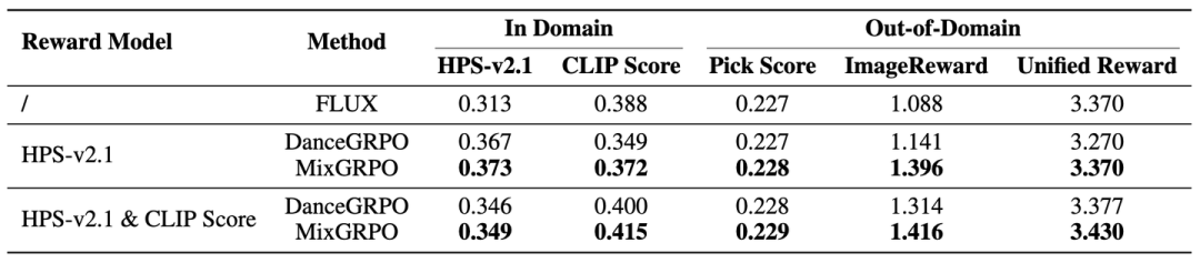 结果(见表2)显示,无论是单奖励还是多奖励,MixGRPO 在域内和域外奖励指标上均取得了最佳性能。更多可视化结果详见附录D。