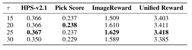 这些指标均基于人类偏好,但侧重点不同,例如ImageReward强调图文对齐和图像保真度,而Unified Reward更关注语义层面。