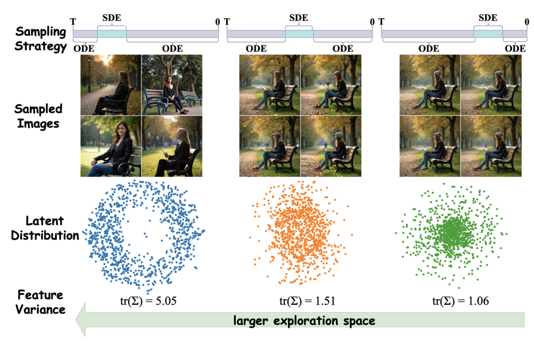 当前概率流模型中的GRPO方法,如Flow-GRPO和DanceGRPO,在每个去噪步骤中利用随机微分方程(Stochastic Differential Equations,SDE)采样引入图像生成的随机性,以解决RLHF中对随机探索的依赖。