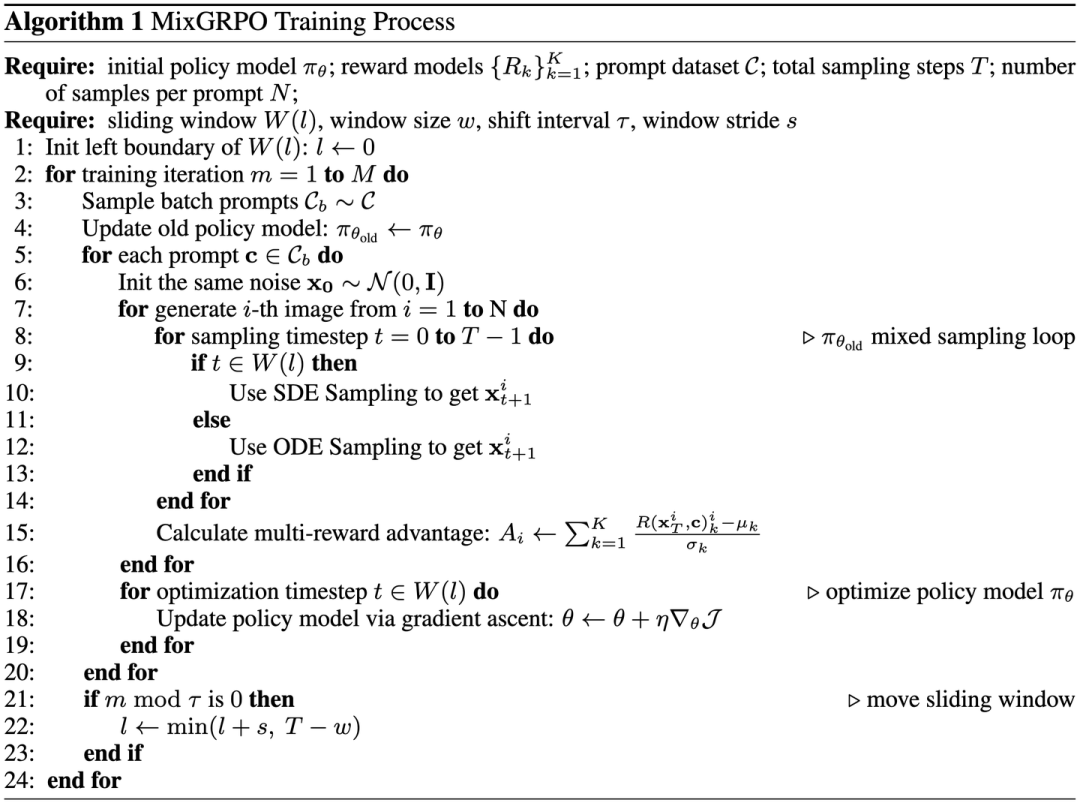 。详细的滑动窗口策略及MixGRPO算法可参见算法1。