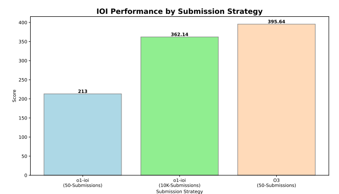 此前,OpenAI在关于推理模型在竞技编程中应用的研究论文报告中显示,o3在IOI 2024的严格规则下拿到了395.64分,达到金牌水平。