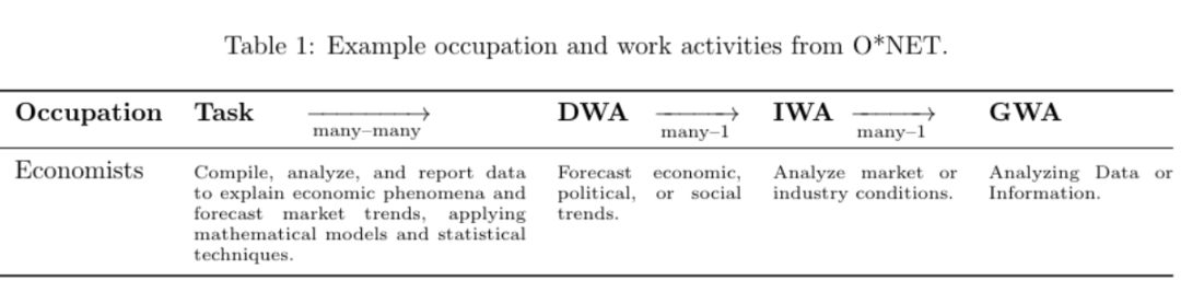 为了让分析跟真实职业挂钩,研究用了O*NET 数据库(美国官方职业信息库),里面把每个职业拆成具体的工作活动。