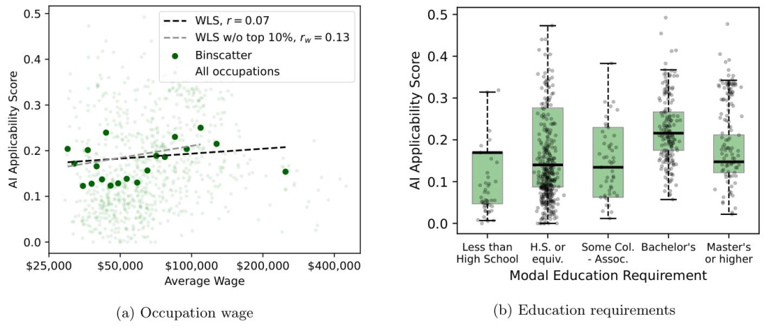 很多人觉得高薪工作更容易被AI替代,但数据不这么说。研究发现,AI适用性分数和职业平均工资的相关性非常弱。