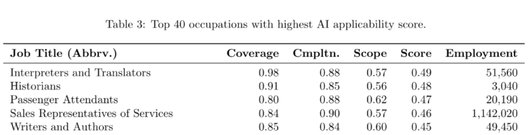 根据得分情况列出了40种最受AI影响的职业榜单。其中得分最高也就是最受影响的职业是翻译员、销售等,AI覆盖率和成功率都在80%以上,适用性近50%。