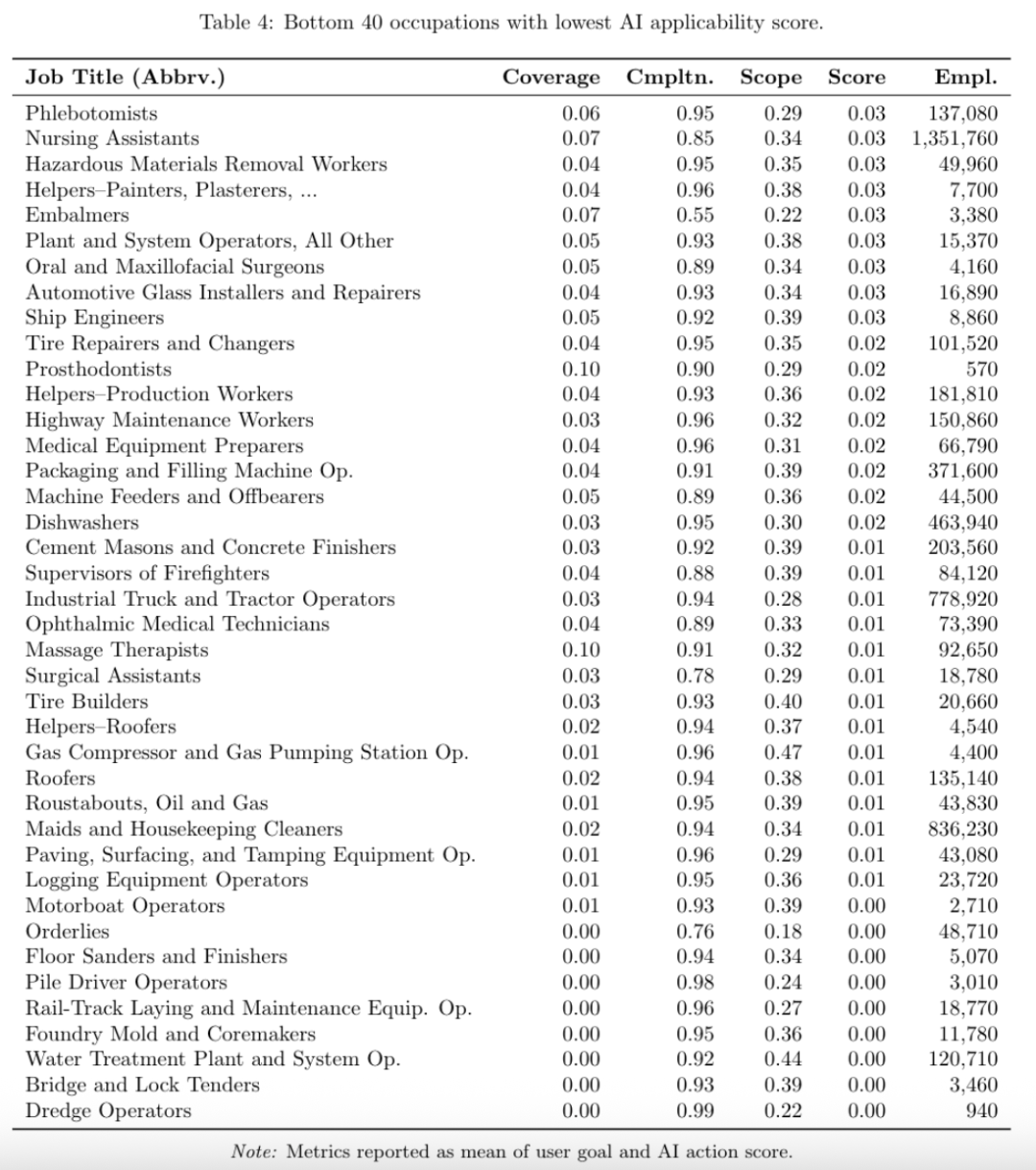 尽管此项研究列出了最受AI影响的职业榜单,但这也并不代表这些岗位会被完全取代,也不意味着体力劳动不会受影响,比如AI应用还可能会涉及机器操作和监控的体力劳动工作。