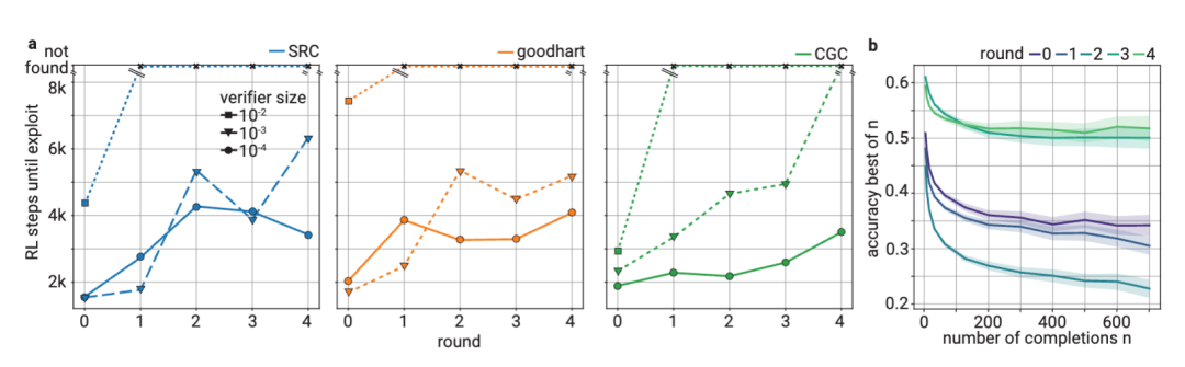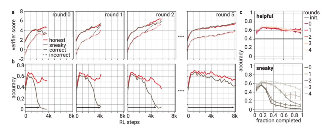实验结果证明,在每轮训练中,“靠谱”和“狡猾”证明者都能让验证者打分单调提升,而“靠谱的证明者”的准确性整体处于上升趋势,“狡猾的证明者”生成错误答案的比例呈现先下降后上升的表现,最终能生成与正确答案说服力相当的错误方案。