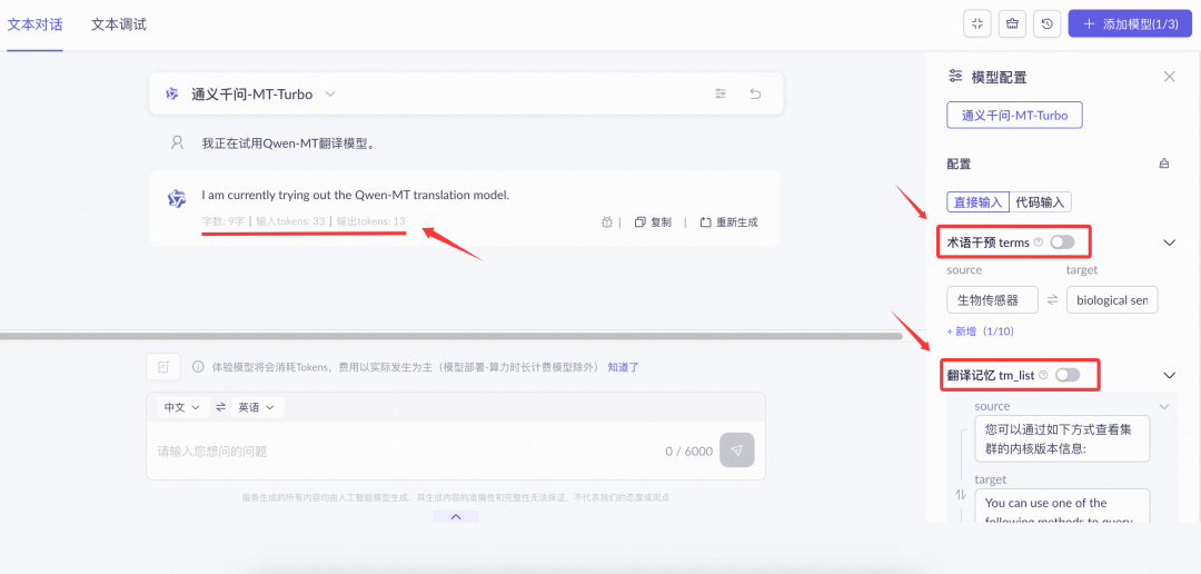 输入内容后进入对话界面,右侧可选择额外功能(术语干预、翻译记忆、领域提示),每次输出会显示使用的token数。