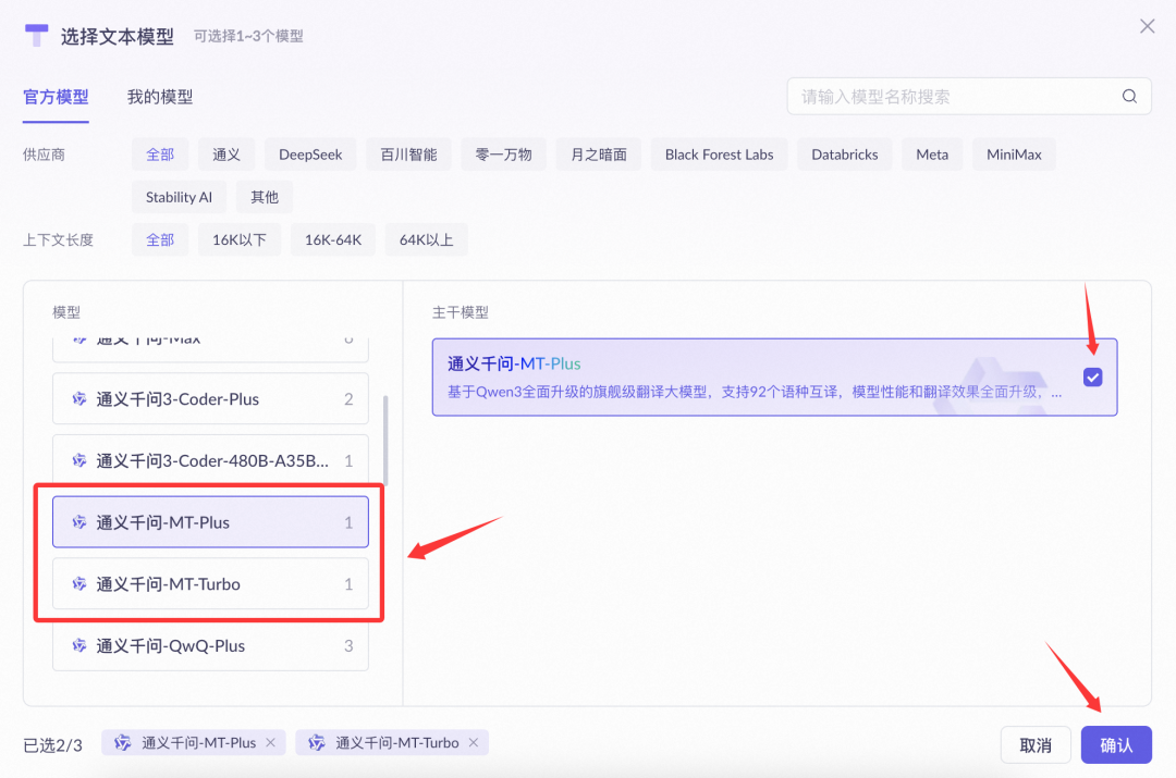 在阿里云百炼的模型广场可以选择试用Qwen-MT-Pro和Qwen-MT-Turbo。