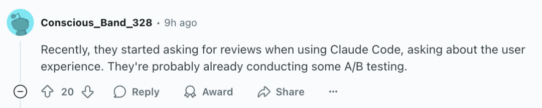 有网友补充说,最近使用Claude Code时会被询问使用体验,可能是在进行一些A/B测试。