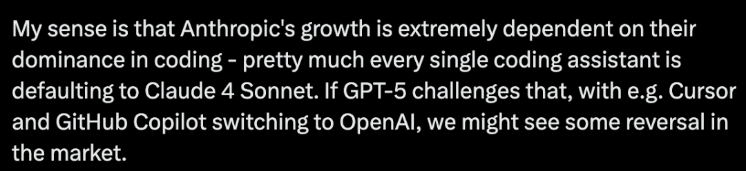 有人就表示,如果GPT-5能成功挑战Claude在编程方面的地位,两大客户被撬走,那AI编程市场将发生反转。