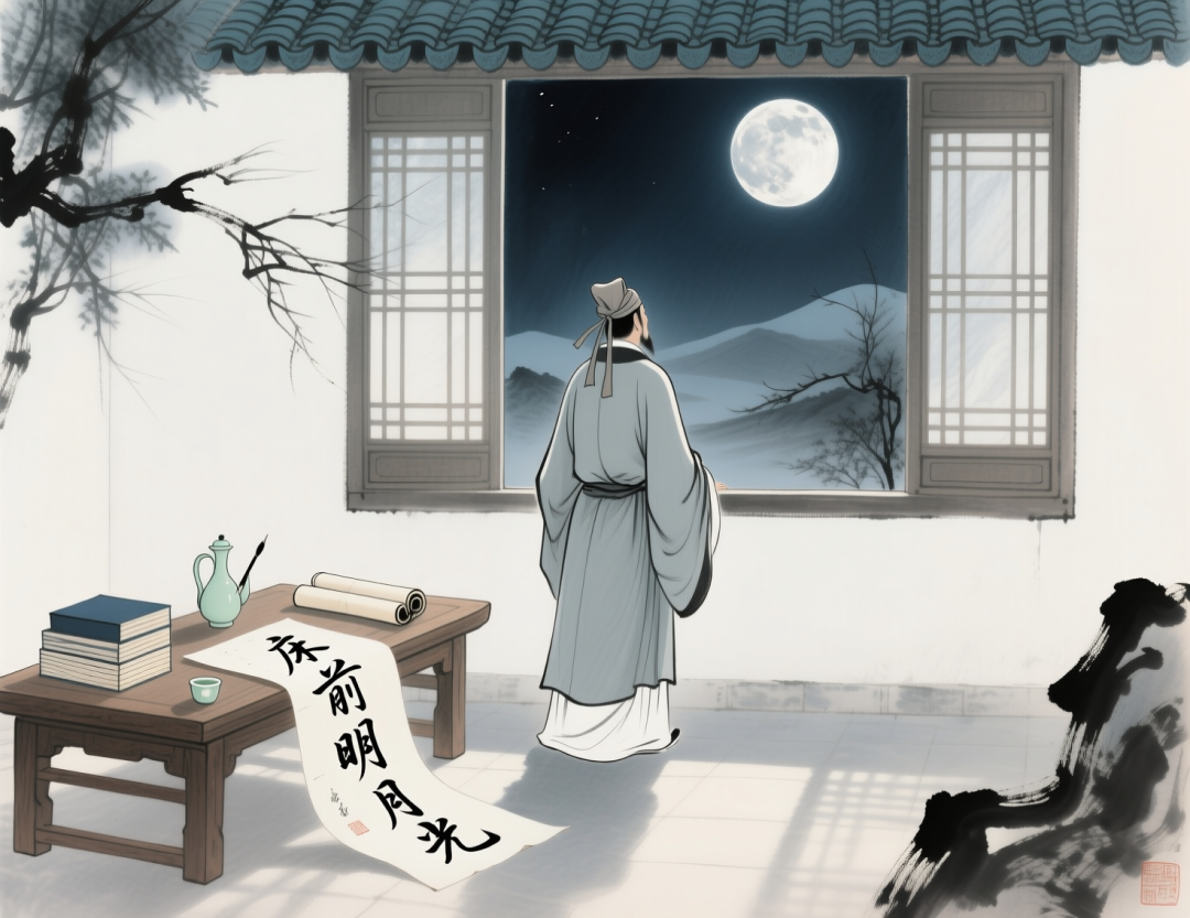 李白站在窗前写“床前明月光”,窗外明月当空,在屋内投下柔和的光线,书桌上有酒和书籍,整体风格古典