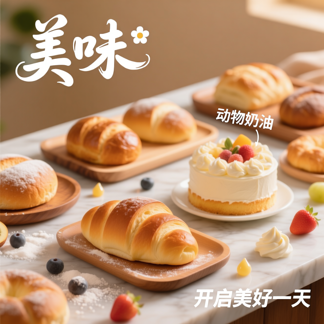 面包店的商品宣传图,画面主体是面包和奶油蛋糕。图中文字展现“美味”、“动物奶油”、“开启美好一天”,字体采用花体字,整体风格轻松活泼。整体采用暖色调