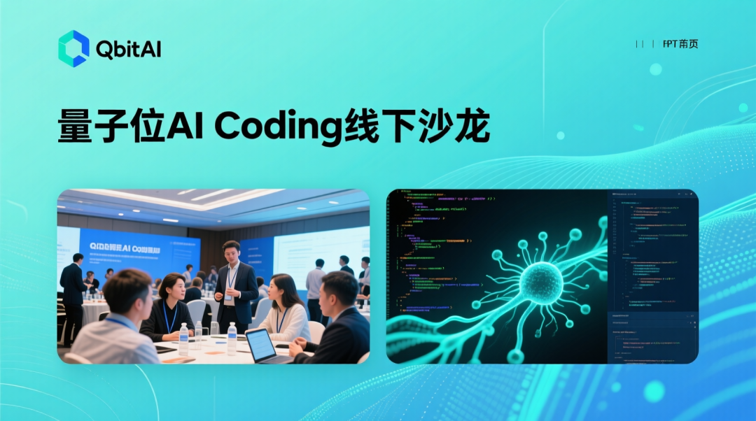 一张企业级高质量PPT页面图像,整体采用简约现代的风格,主题颜色是蓝绿色,背景用线条和粒子营造科技感,页面顶部左侧清晰展示QbitAI的标志。主标题位于画面中央偏上,文字内容为“量子位AI Coding线下沙龙”,字体规整简介,突出技术感。主标题下方放两张图,一张是线下沙龙现场照片,另一张体现AI编程